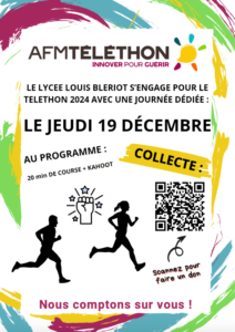 Cette année encore, le lycée s’engage pour le Téléthon, sous l’impulsion des enseignants d’EPS. Voici le lien vers la page de collecte du lycée si vous souhaitez participer à la collecte.
